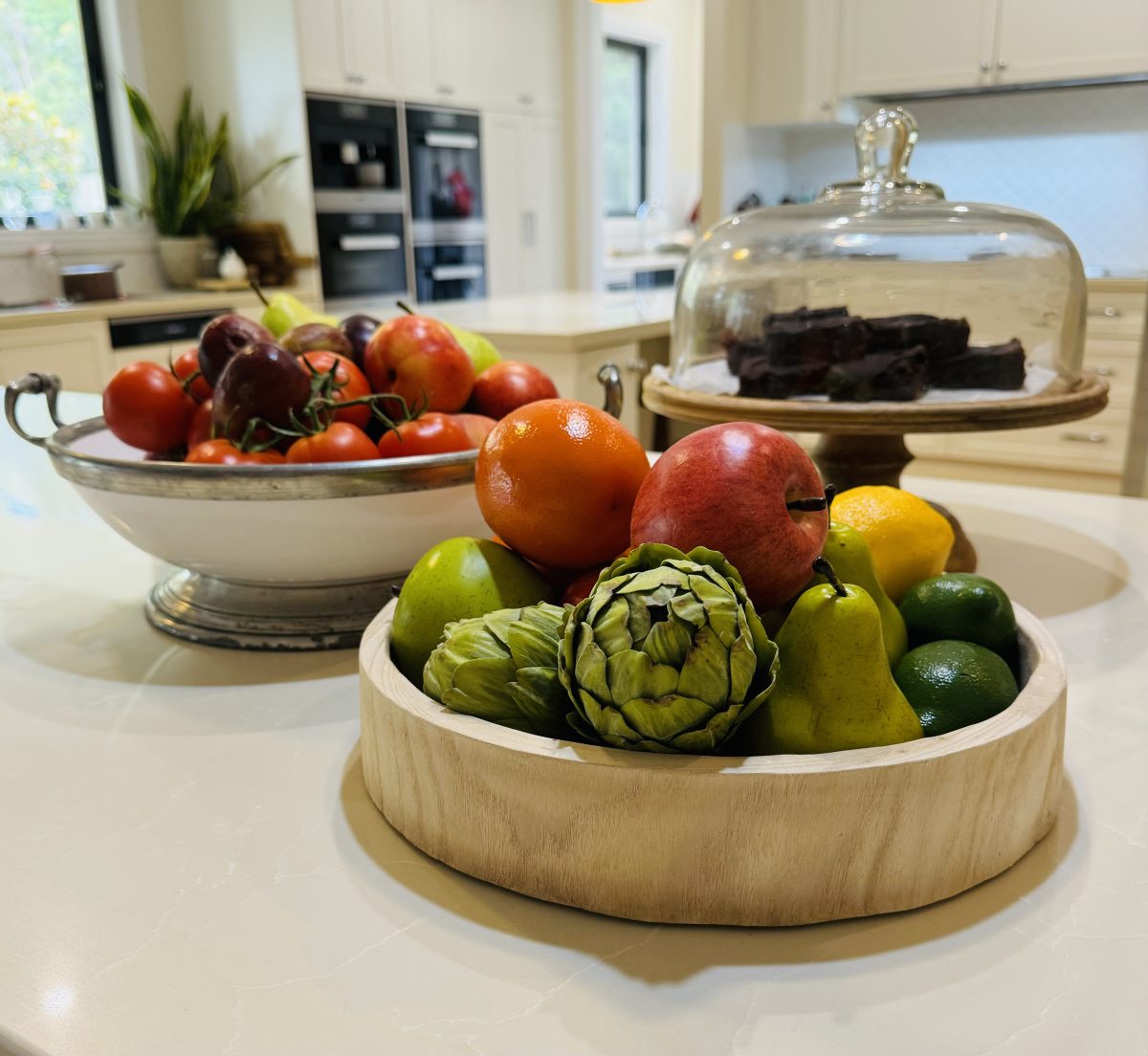 Purchase Faux Fruit Bowl | Styled Tray – is one of our best-selling trays for the perfect fruit bowl arrangement all year round, minus the fruit fly’s! This arrangement takes fake fruit and vegetables to the next level of kitchen bench styling.