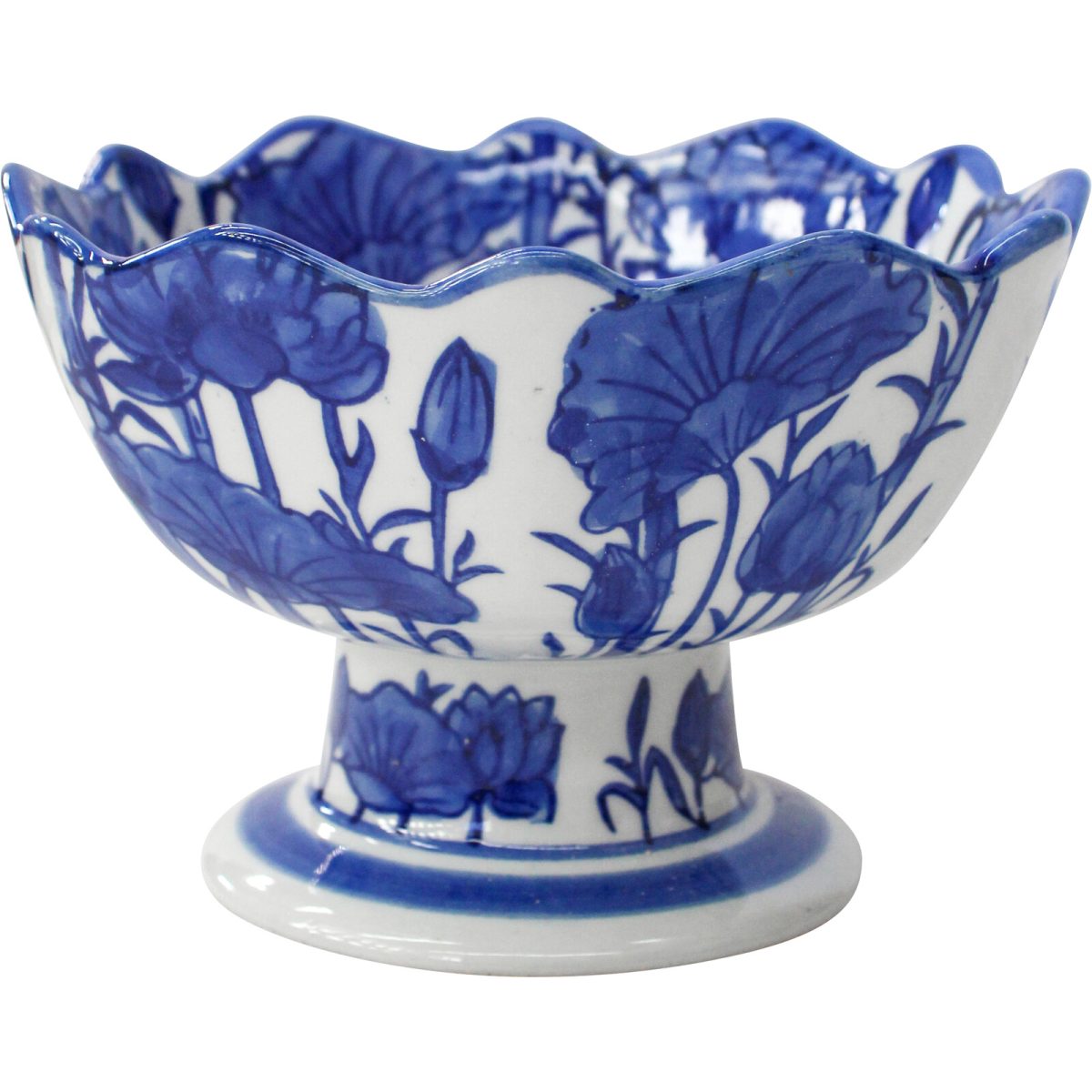 Footed porcelain scalloped bowl in blue. 14x14x9cm